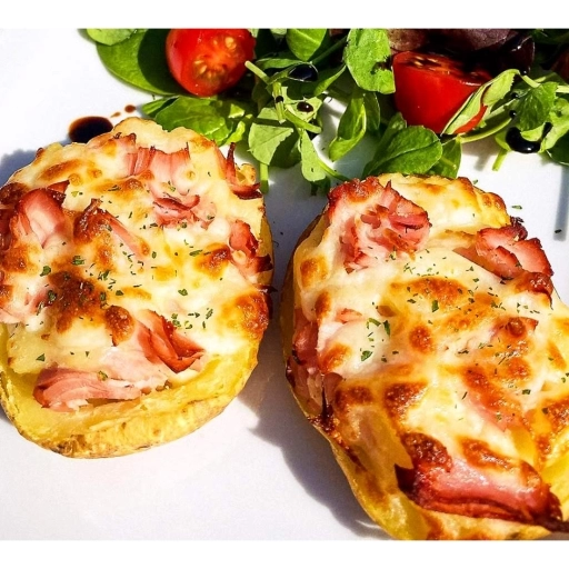 Batata, carne assada, mussarela , cebola caramelizada, requeijão , bacon e calabresa